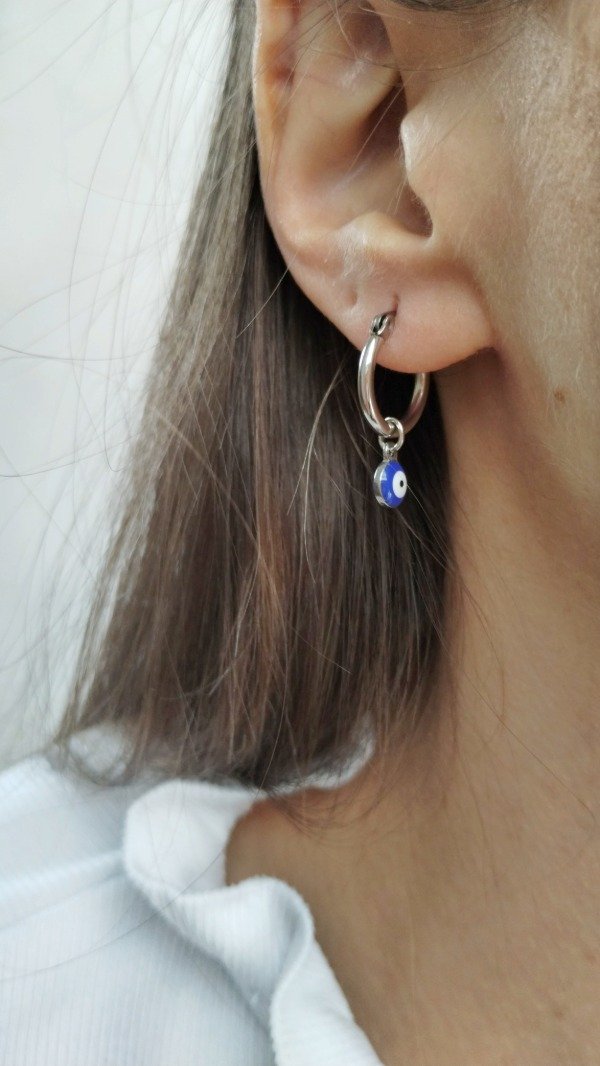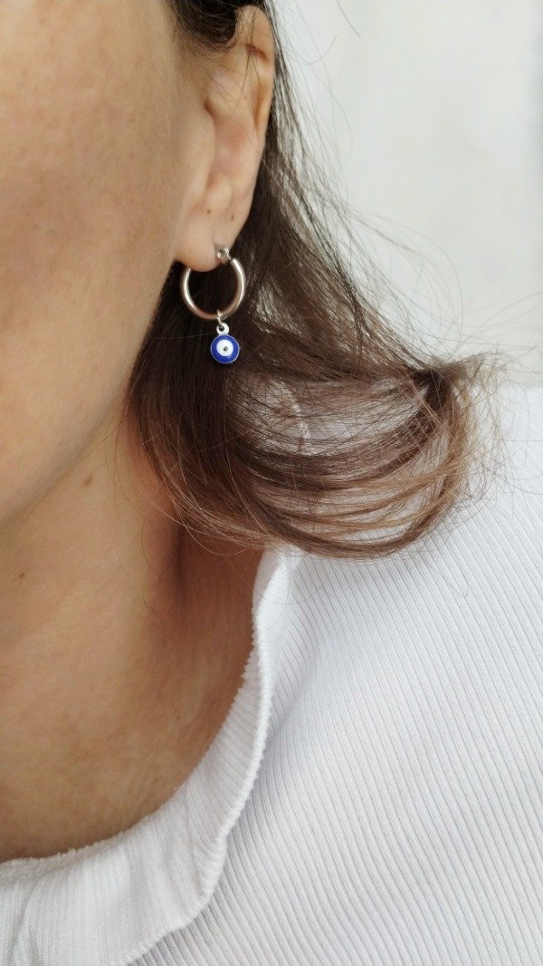Argollitas de acero quirúrgico, con dije de acero quirúrgico esmaltado.