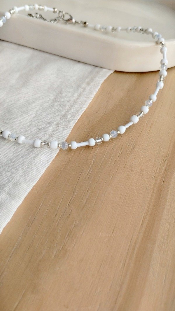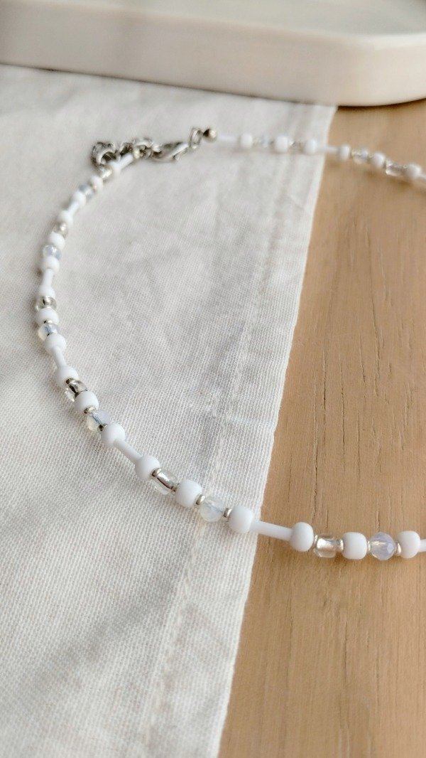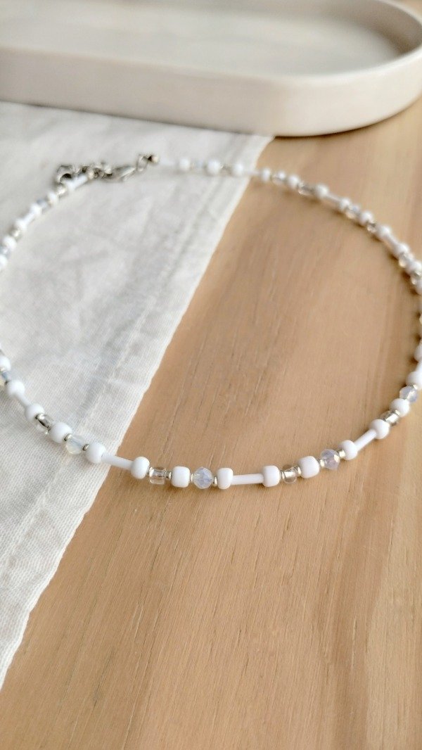 Collar realizado con mostacillones y canutillos de vidrio, mini cristales y detalles en plateado.