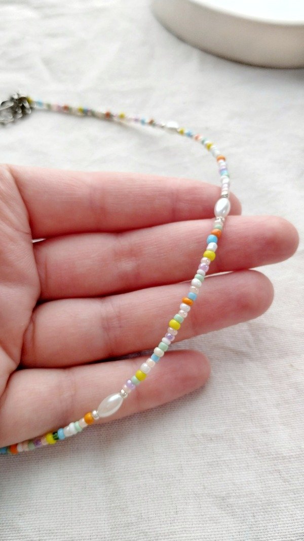 Collar enhebrado con mini mostacillas de vidrio y perlas.