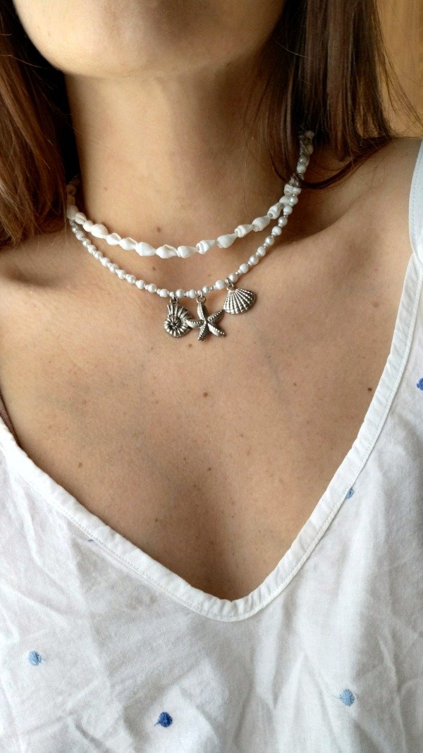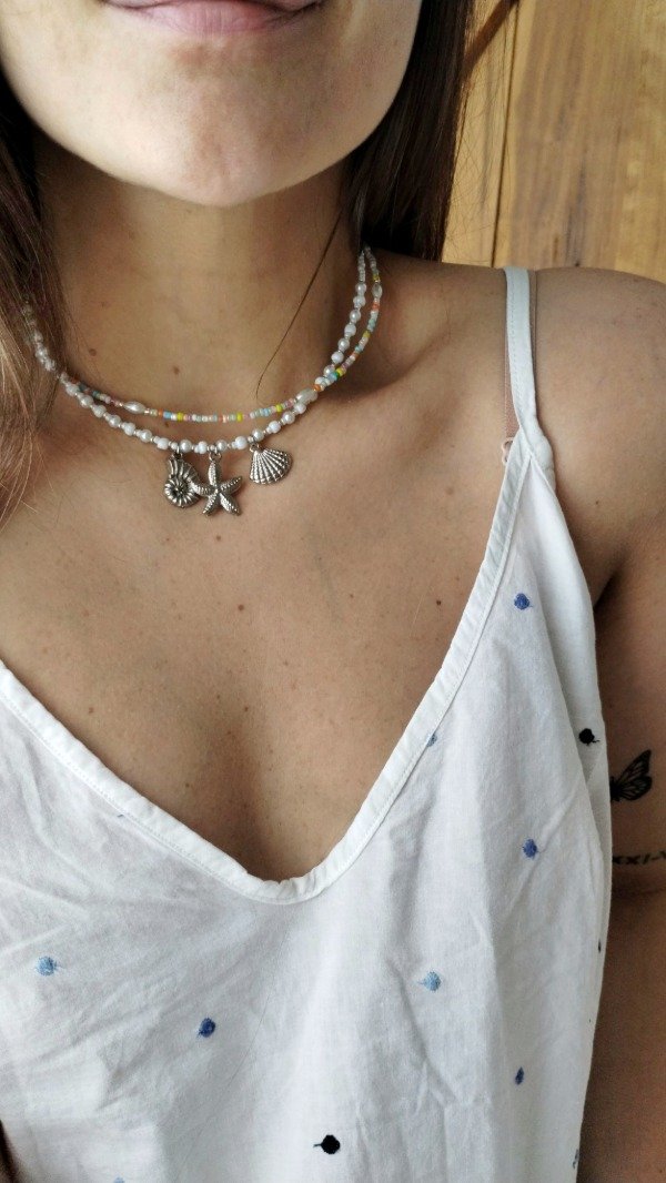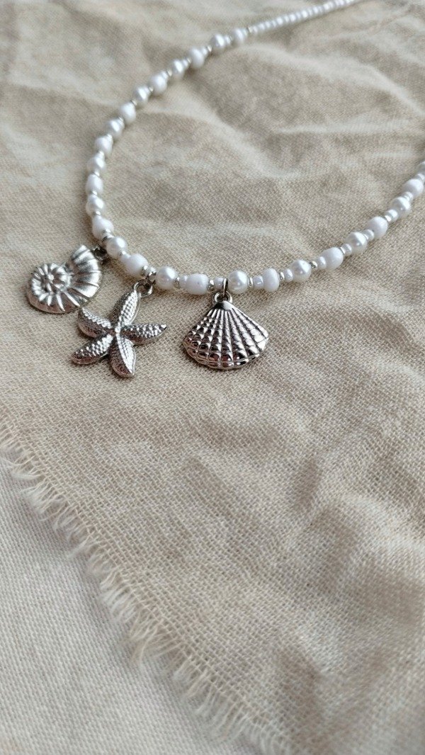 Collar enhebrado con mini mostacillas, mostacillones y perlas de vidrio con dijes de fundicion.