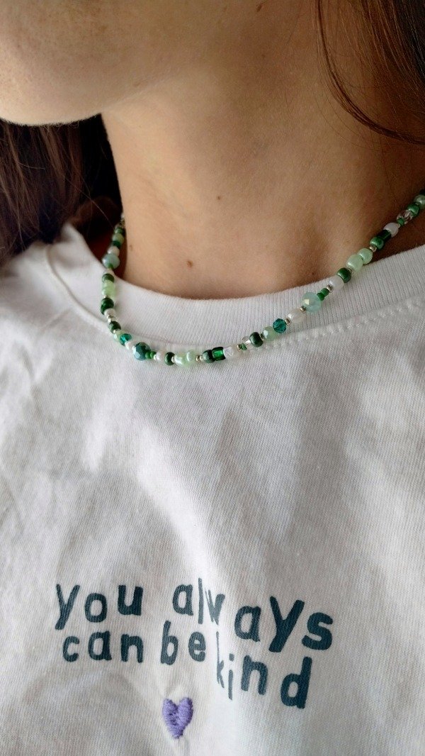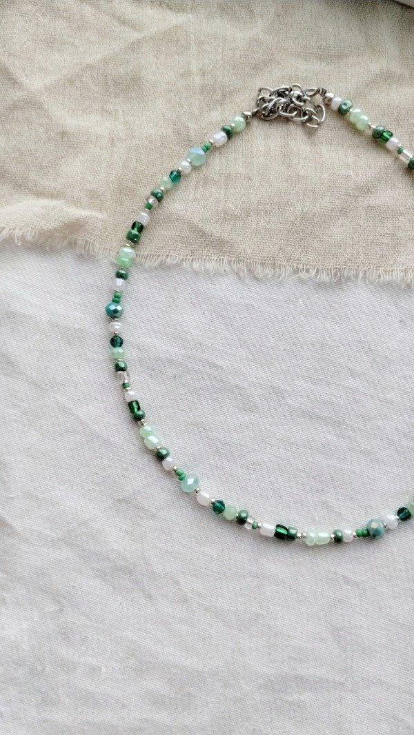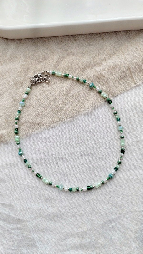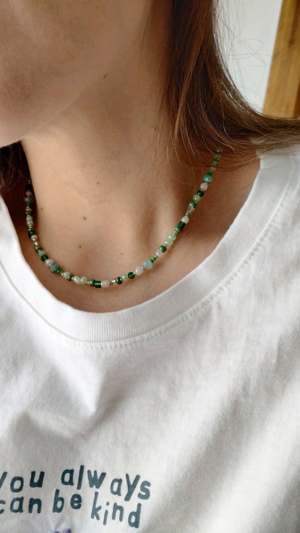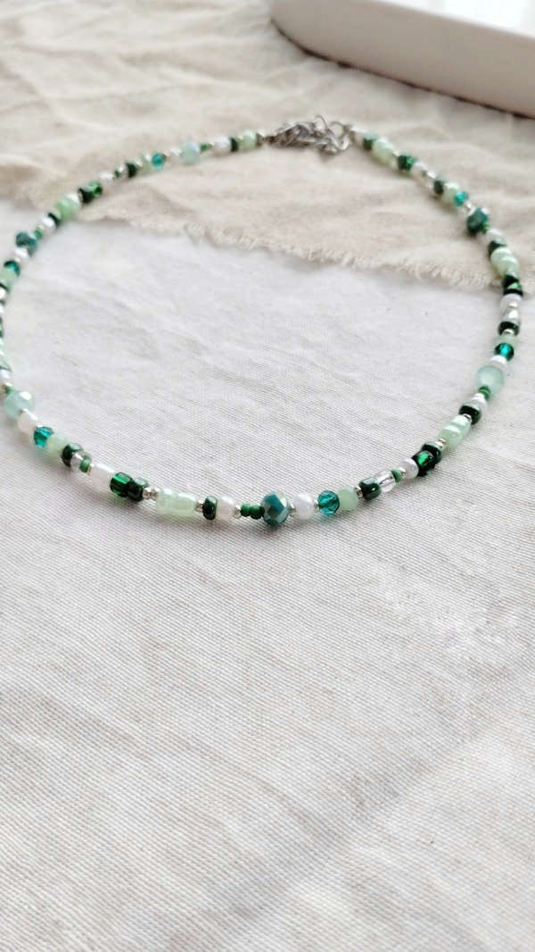 Collar enhebrado con cristales, bolitas de vidrio y mostacillones en la misma gama de colores.