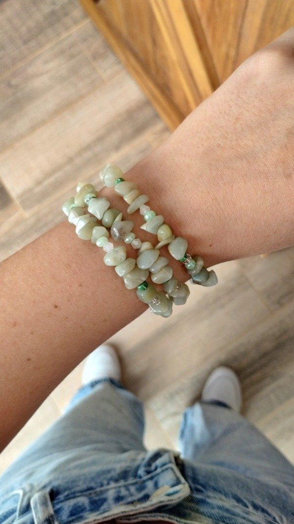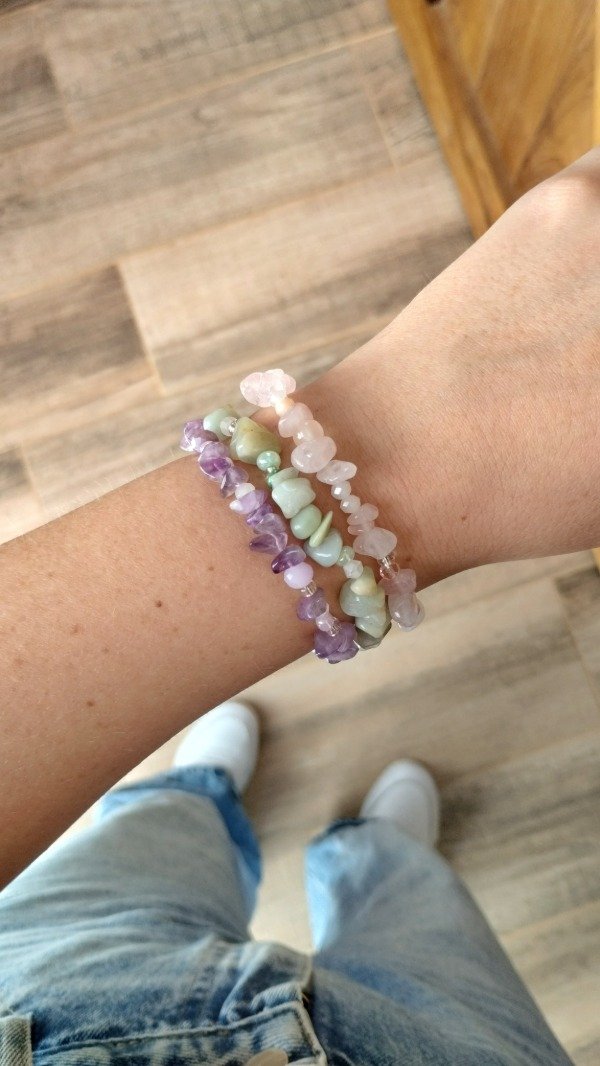 Pulseras elasticas. Enhebradas con escallas de piedras naturales y cristales de vidrio.