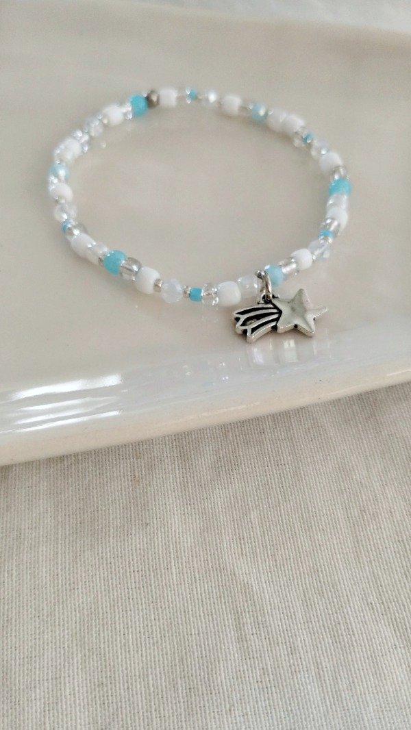 Pulsera elastizada. Realizada con mostacillones y bolitas de vidrio, con dije de fundicion.