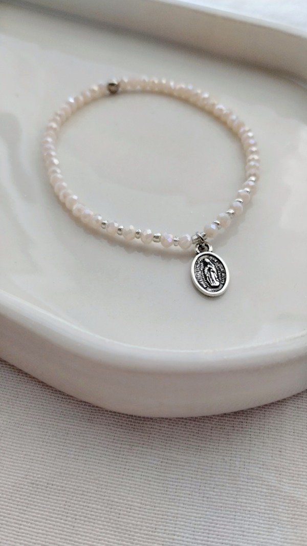 Pulsera elástizada. Realizada con mini cristales de vidrio y dije de fundicion.