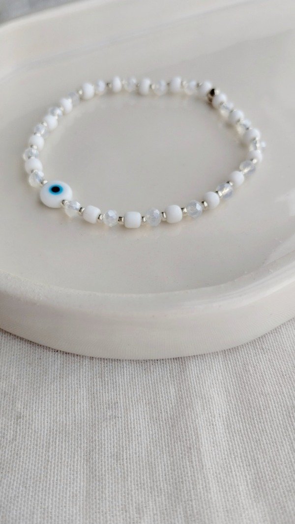 Pulsera elástizada. Realizada con mostacillones, mini cristales y ojo turco de vidrio.
