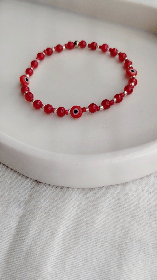 Pulsera elástizada. Realizada con bolitas y ojitos turcos de vidrio.
