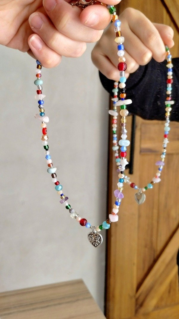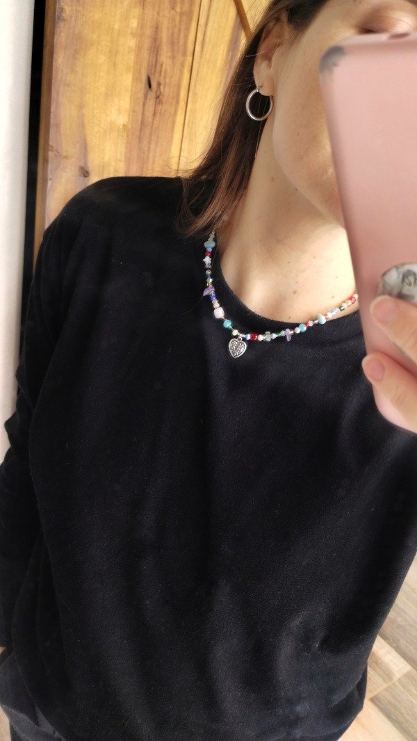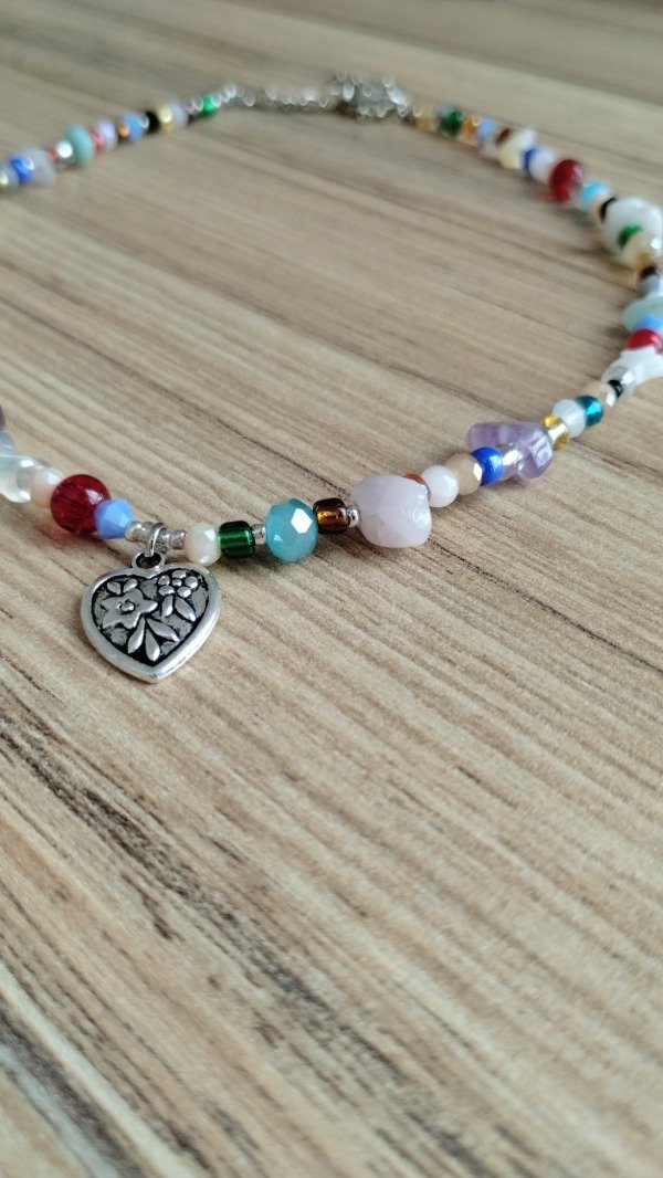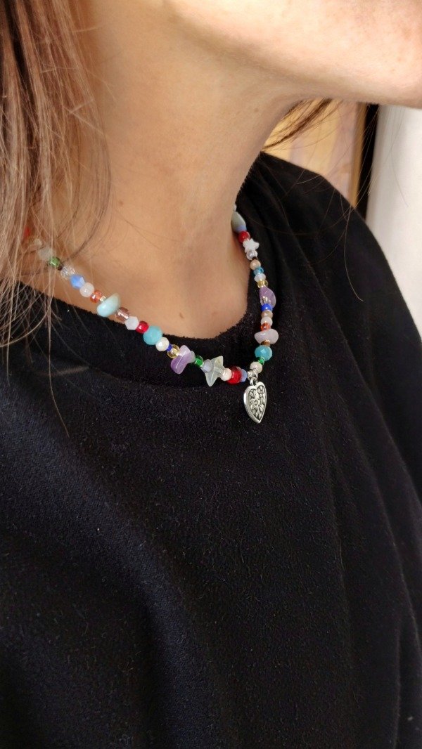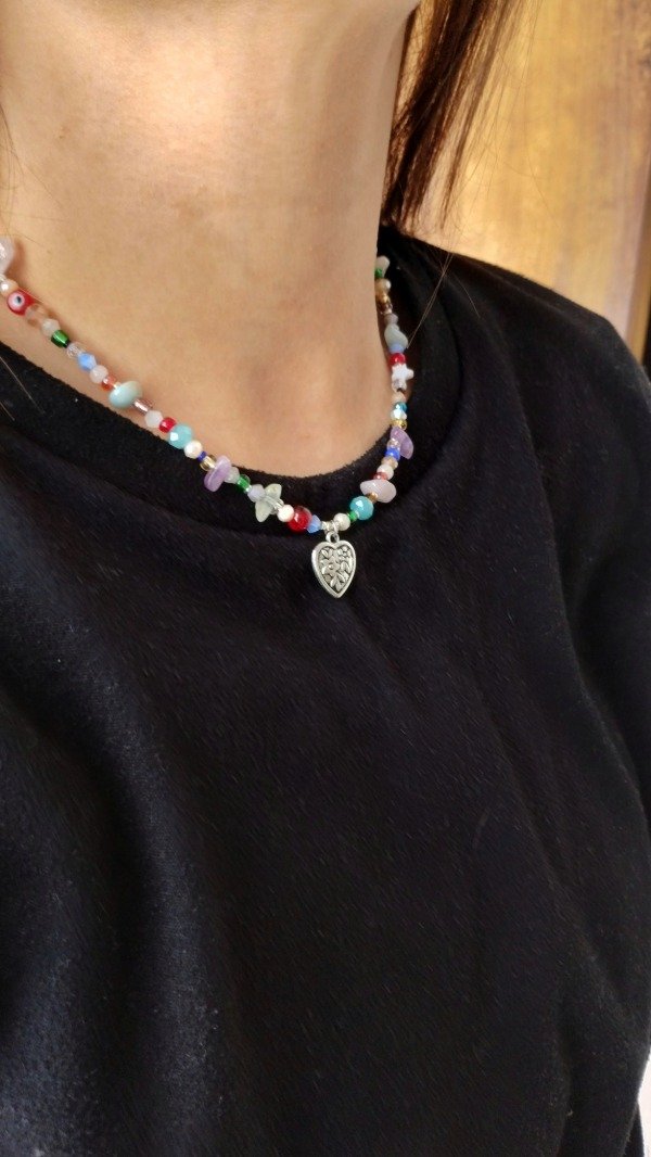 Collar enhebrado con escallas de piedras naturales, nacar, ojo turco, piezas de vidrio y mini cristales con dije central de fundición.