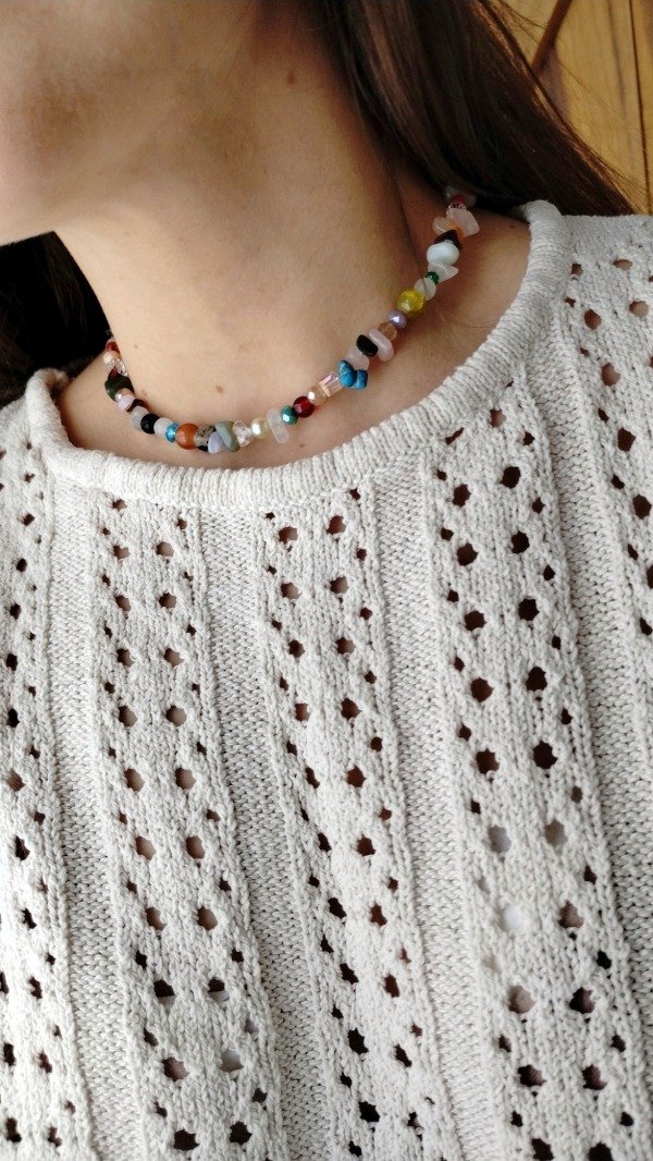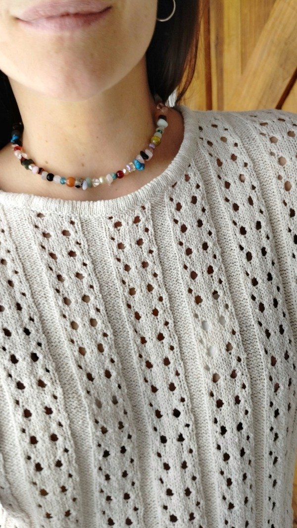 Collar enhebrado con diferentes escallas de cuarzos y piezas de vidrio.