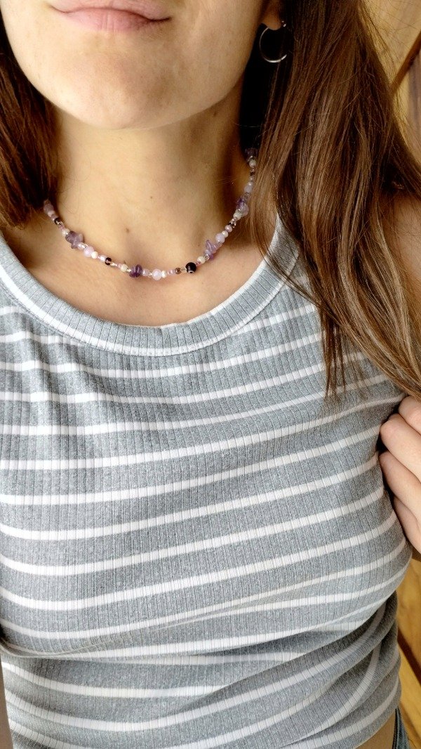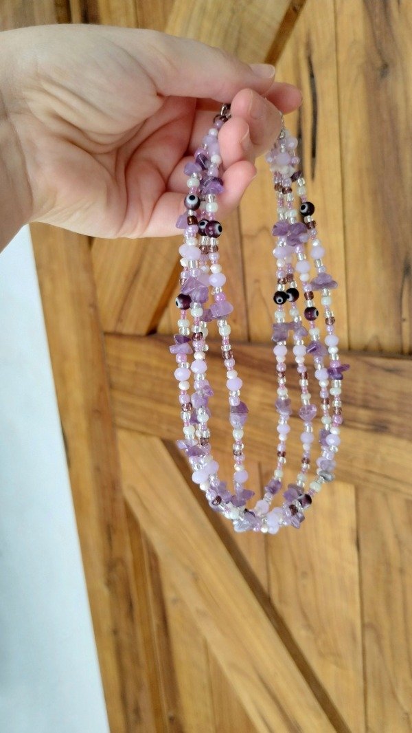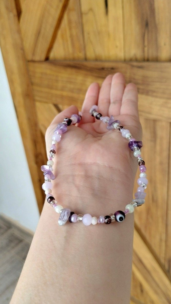 Collar enhebrado con cristales, bolitas de vidrio, ojitos turcos y escallas de Amatista.