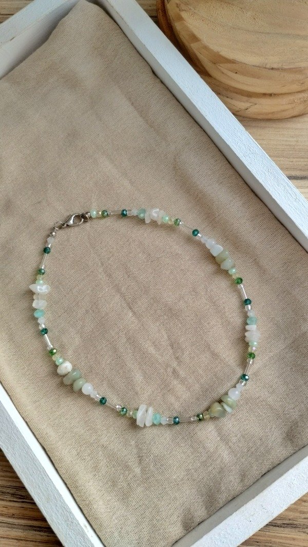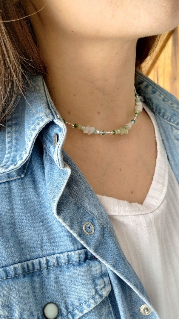 Collar enhebrado con escallas de amazonita y cuarzo blanco, mini cristales de vidrio y canutillos.