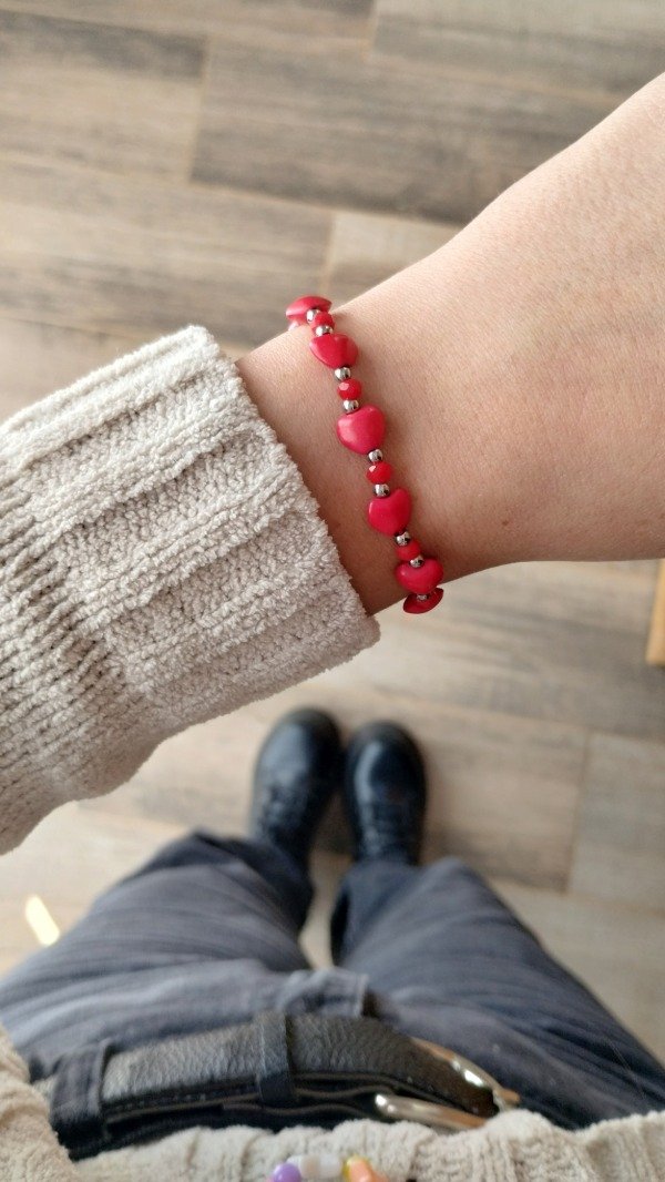Pulsera regulable. Enhebrada con mini corazones de piedra reconstituida, cristales de vidrio y detalles en acero quirúrgico.