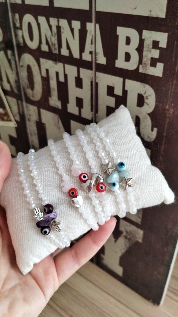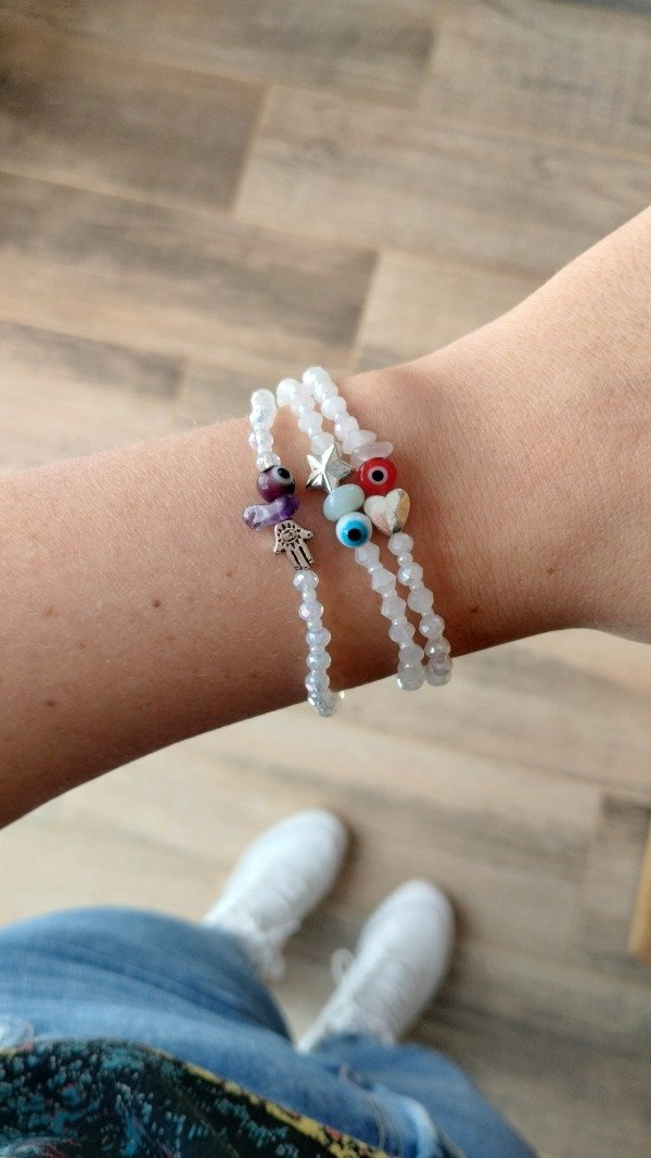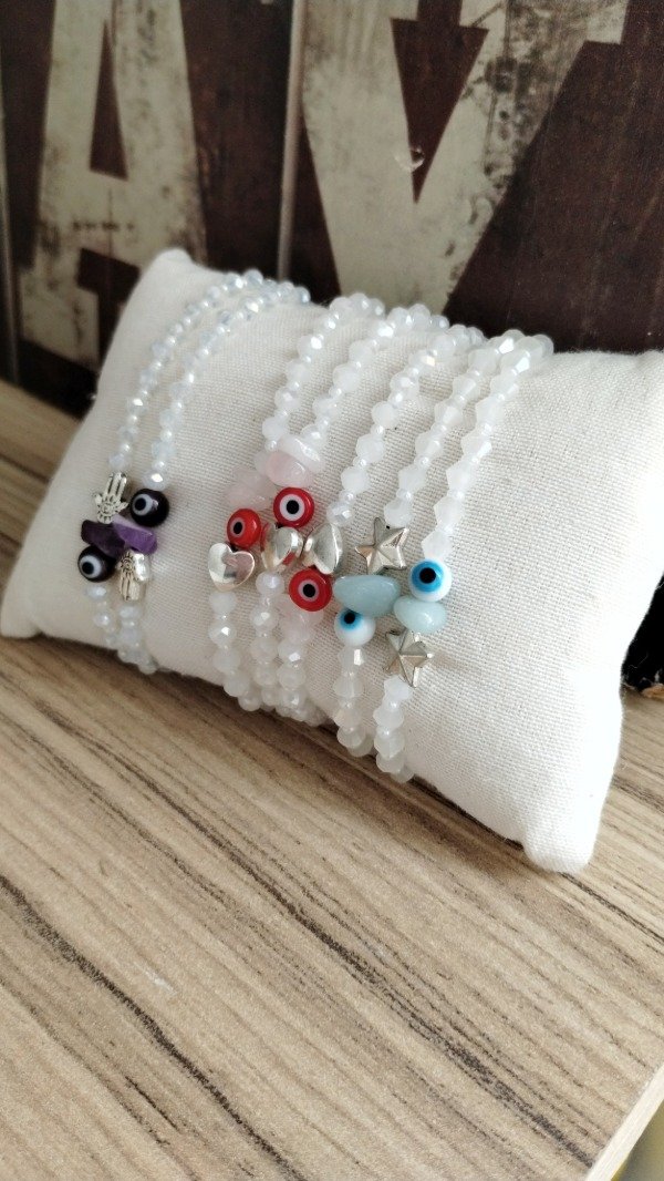 Pulseras elastizadas. Enhebradas con cristales de vidrio, ojo turco protector, dijes y escallas de piedras naturales.