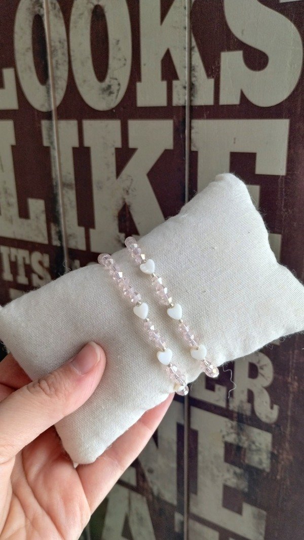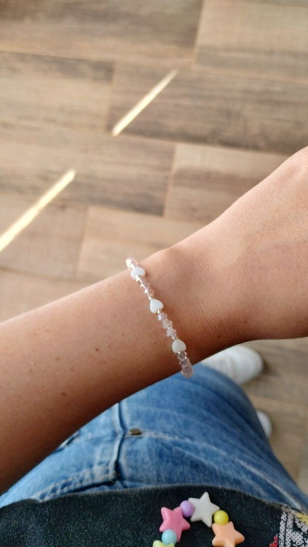 Pulsera elastizada. Enhebrada con microcristales de vidrio y mini corazones de nacar.